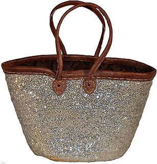Sac de plage,panier à paillettes-sac à main fourre tout-cabas en paille de palmier, les anses et renfort en cuir véritable sont cousus à la main, unique et élégant