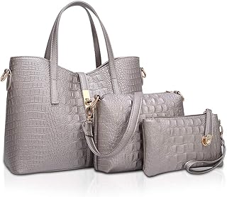 Sac à Main pour Femme 3 Pcs Ensemble Sac d'épaule Sac à Main fourre-Tout + Sacs à bandoulière + Porte-Monnaie, Sac à Main en Crocodile Gris